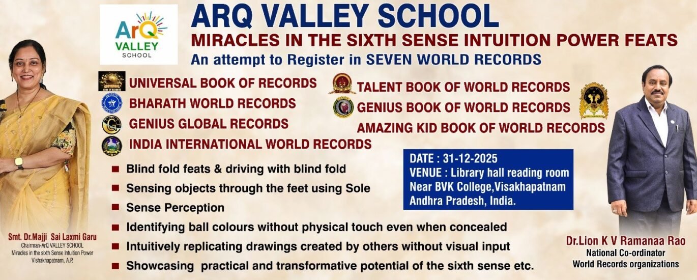 Has registered in Seven World Records that is Bharath World Records, Talent Book of World Records, Genius Book of World Records, Universal Book of Records, Genius Global Records, India International World Records & Amazing Kid Book of World Records for the extreme talent in Sixth sense remarkable feats such as performing activities while blindfolded, feats and driving with blindfold, sensing objects through the feet using sole-sense perception, identifying ball colors without physical touch even when concealed, and intuitively replicating drawings created by others without visual input—showcasing the practical and transformative potential of the sixth sense, organised and trained by Mrs. Dr. Majji Sai Laxmi – Chairman, ArQ Valley School, Andhra Pradesh, India.